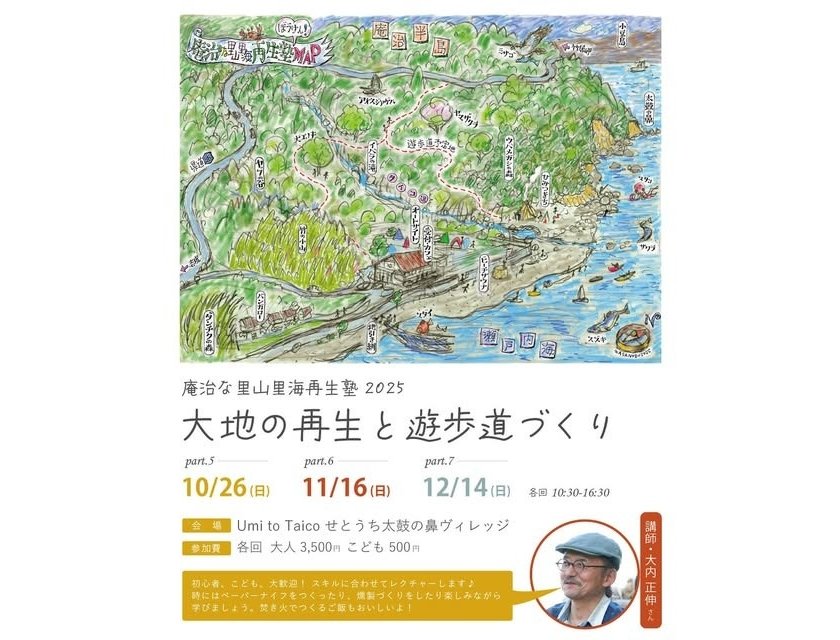 イラストレーターで「大地の再生実践マニュアル」の著者である大内正伸さんを講師にお迎えして、周囲の自然環境を回復させる「里山里海」再生のためのノウハウや遊びを含んだ技術を学ぶワークショップシリーズ。