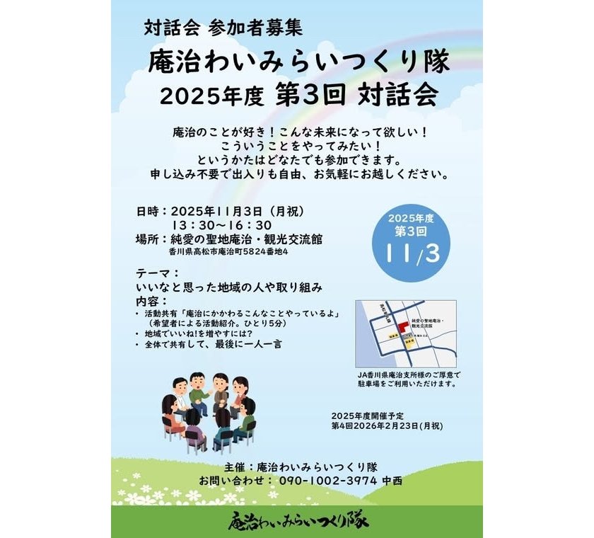 2025.10.15 イベント 庵治わいみらいつくり隊 対話会 次回、対話会は11/3です。 庵治が好き!という方も なんか気になる、、という方も どなたでも参加できます。 申し込み不要で出入りも自由、 お茶を飲みに行く感覚でお気軽にお越しください。
