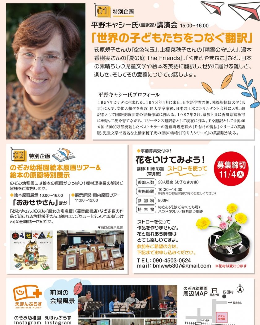 2025.11.05 イベント 絵本+絵本の世界を体験しよう!in屋島のぞみ幼稚園 特別企画 平野キャッシー氏講演会 『世界の子どもたちをつなぐ翻訳』 数々の有名な絵本の翻訳を手掛け、日本の素晴らしい児童図書や絵本を英語に翻訳。 世界に届ける難しさ、楽しさ、そしてその意義についてお話しします! その他、親子で楽しめるワークショップなども出店します! ぜひご家族でお友達同士でご来場下さい♪ なお、駐車場はありませんので近隣又は交通機関をご利用下さい。