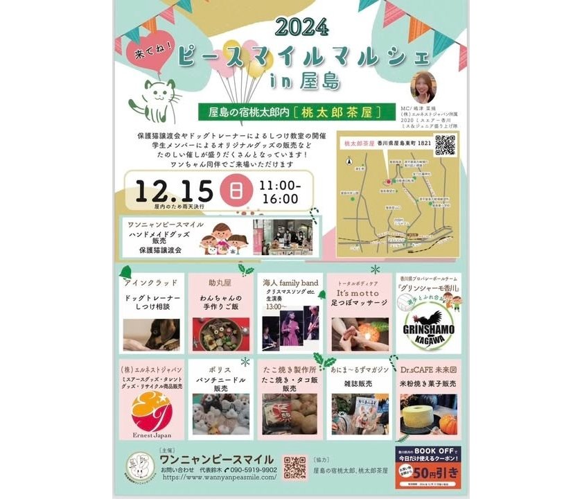 2024.11.28 屋島山上イベントイベント 2024ピースマイルマルシェin屋島 保護猫譲渡会やドッグトレーナーによるしつけ教室 学生メンバーによるオリジナルグッズ販売 ワンちゃんをお連れして来場できます ミス&ジュニアで会場を盛り上げる撮影会もありますので楽しみにして下さい。 開催日時 12月15日(日)11時~16時 場所 桃太郎茶屋 お問い合わせ ワンニャンピースマイル