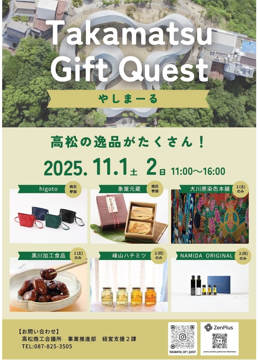 2025.10.22 屋島山上イベントイベント Takamatsu Gift Quest やしまーる 高松の逸品がたくさん! ~Explore and discover charming gifts from Takamatsu~ Hosting a market featuring charming gifts from Takamatsu! 開催日時 2025/11/1,2 11:00-16:00 場所 やしまーる761-0111 高松市屋島東町1784番地6 お問い合わせ 高松商工会議所 事業推進部 経営支援2課TEL087-825-3505