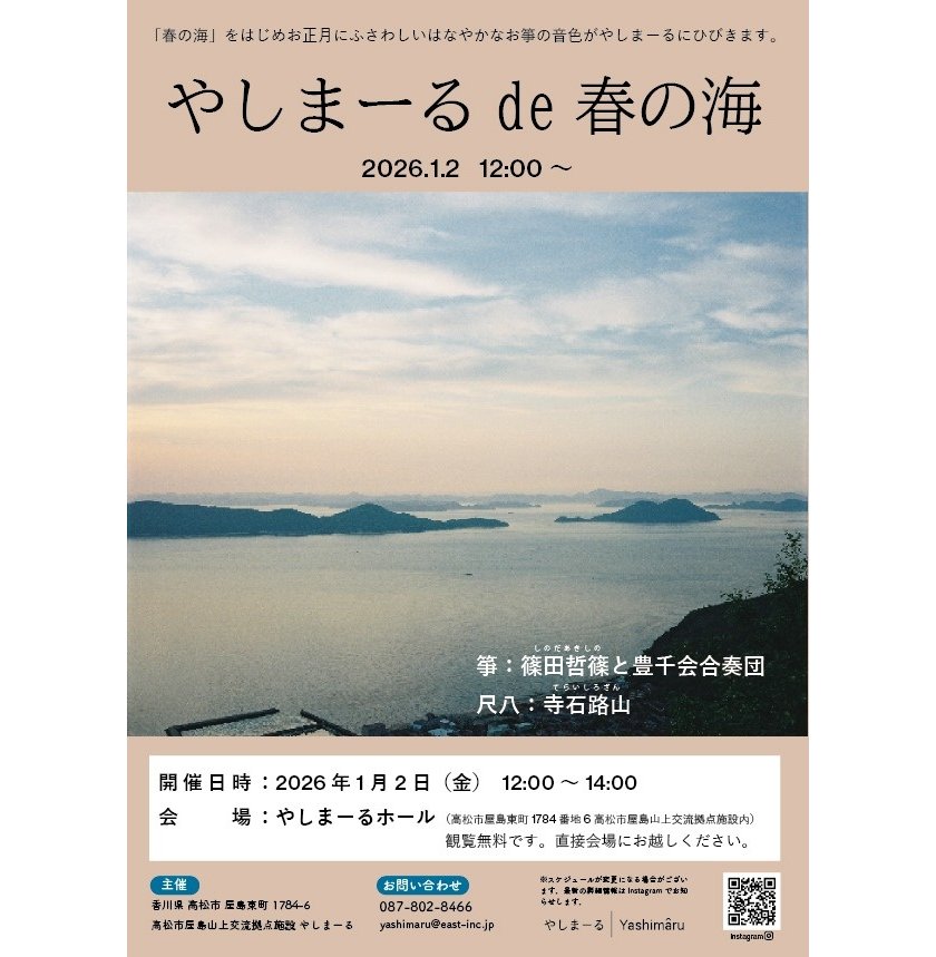 香川を拠点に活動する和楽演奏団体「豊千会合奏団」篠田哲篠さんと、尺八演奏家の寺石路山さんらによる新春コンサートを開催します。お正月の定番曲「春の海」を奏でるお箏と尺八の音色で、新春気分を満喫していただけます。