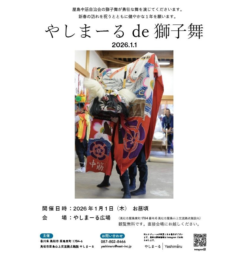 2025.12.10 屋島山上イベントイベント やしまーるde獅子舞 屋島中筋自治会の獅子舞が勇壮な舞を演じてくださいます。 新春の訪れを祝うとともに健やかな1年を願います。 開催日時 2026年1月1日(木)昼頃 会場 やしまーる広場高松市屋島東町1784番地6高松市屋島山上交流拠点施設内 観覧無料です。直接会場にお越しください。 お問い合わせ 高松市屋島山上交流拠点施設 やしまーる TEL 087-802-8466