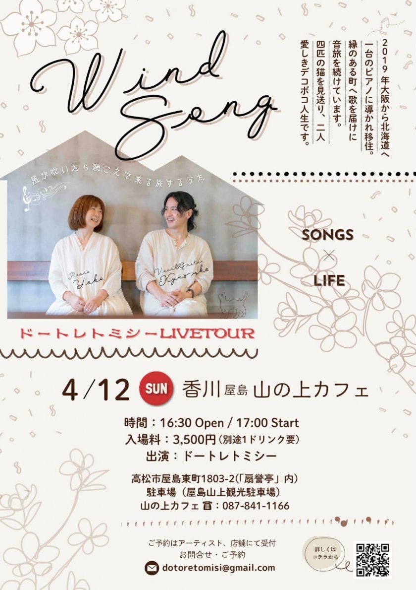 香川県出身でギター&ボーカルを担当する匡祐さんと、兵庫県出身でピアノを担当するyokoさん。小西健二音楽堂のピアノに出逢い、2019年より北海道の東川町へ移住されています。音楽を起点に、地域に寄り添う活動もたくさんされています。全国を回りながら、香川県・屋島にも寄ってくださります