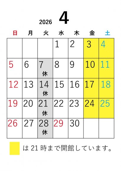 | 開館時間 | 9:00~17:00(金・土・祝前日は9:00~21:00) |