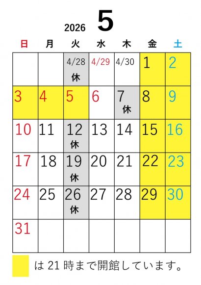 | 開館時間 | 9:00~17:00(金・土・祝前日は9:00~21:00) |